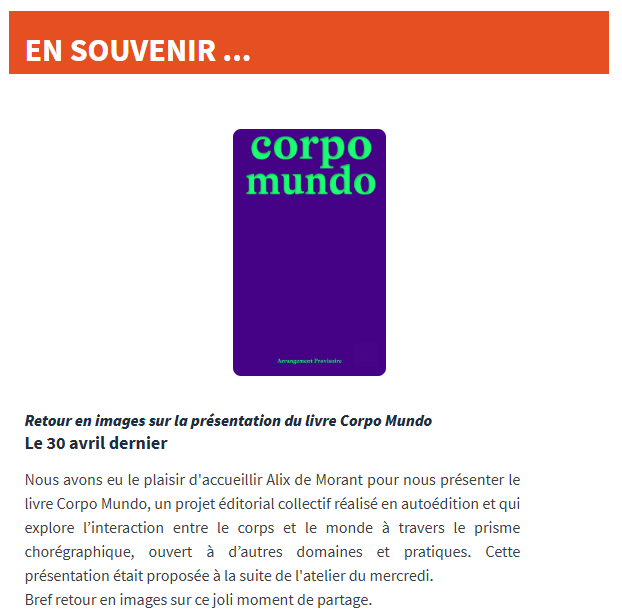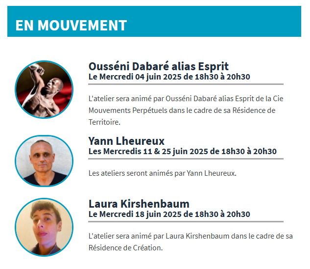 Crédits photos : Cie Mouvements Perpétuels, Laura Kirshenbaum, Marc Ginot, Marek Stepanek, JF Granadel, Arts Fabrik, Bernard Bonicelli